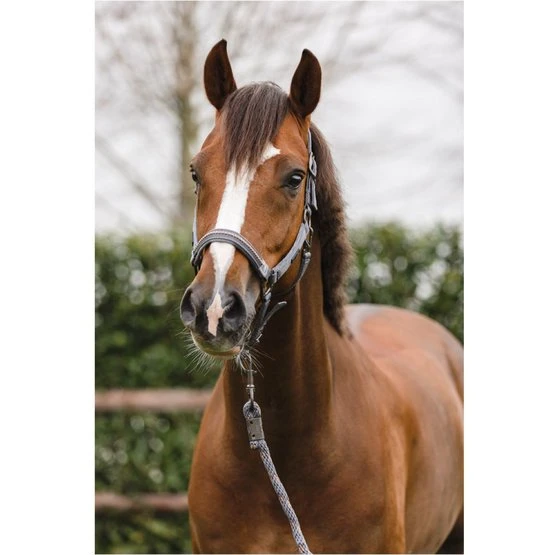 Das Halfter besteht aus Polyesterbändern und enthält sehr starke Nickelschnallen in einer matten, dunklen Farbe. Für eine gute Passform ist das Halfter am Genickstück und am Nasenriemen verstellbar. Der Halsriegel lässt sich auf einer Seite abnehmen, um das Zähneputzen zu erleichtern.