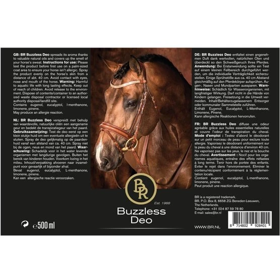 BR Buzzless Deo entfaltet einen angenehmen Duft dank wertvollen, natürlichen Ölen und überdeckt so den Schweißgeruch Ihres Pferdes. Inhalt: 500 ml.