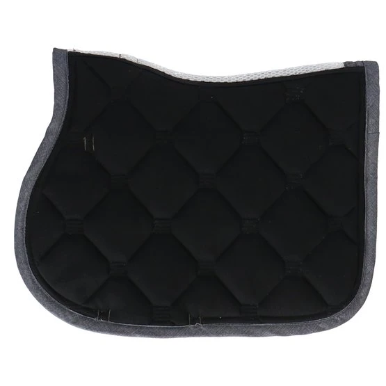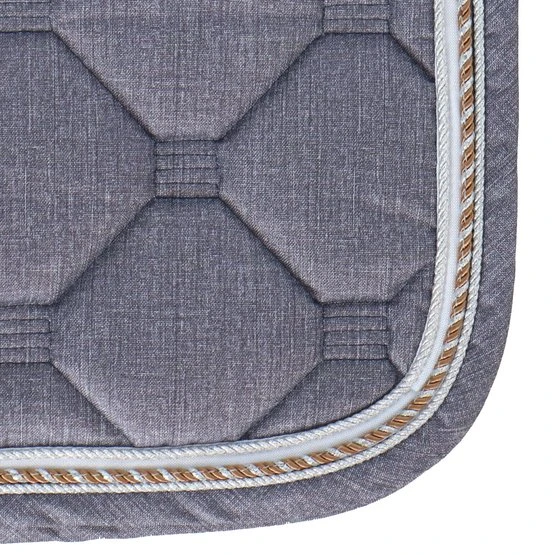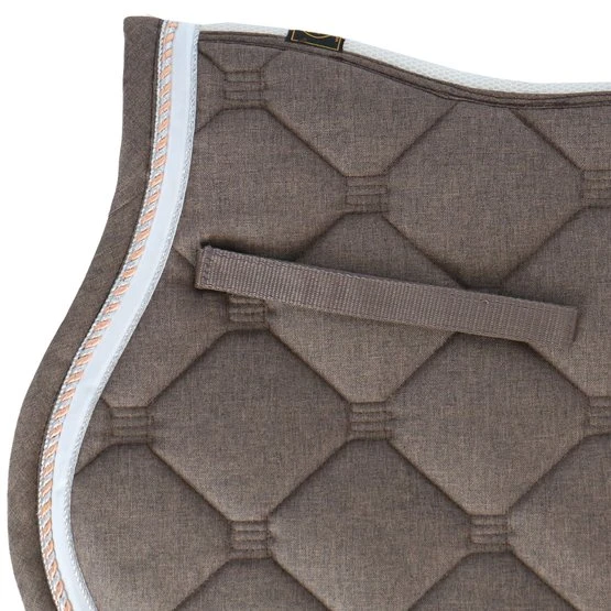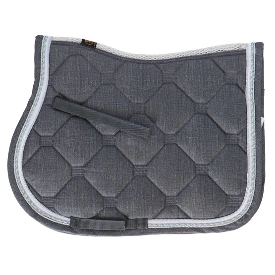 Stylische Schabracke aus Polycottongemisch mit einer Airflow-Rückennaht um die Luftzirkulation anzuregen. Die Schabracke hat eine 400 g Füllung, 8 mm Schaumpolster und ein Ciba behandeltes (feuchtigkeitsregulierendes) Polyester-Airflow-Futter. Es hat einen Einfass aus Airflow-Polyester und eine 3-reihige Silberkordel. Gurtstrippen- und Sattelgurtbefestigung mit Kletverschluss.