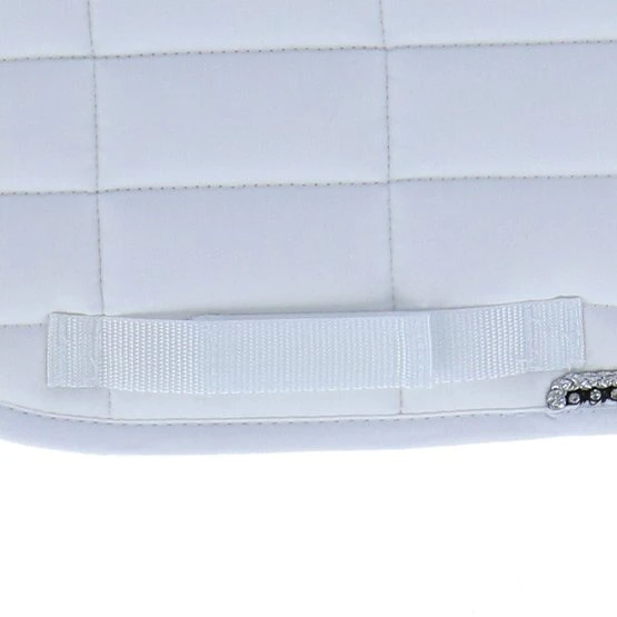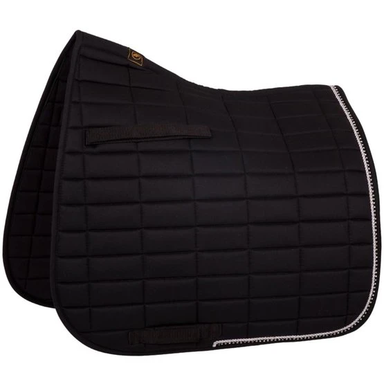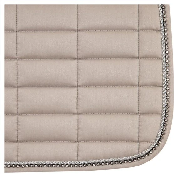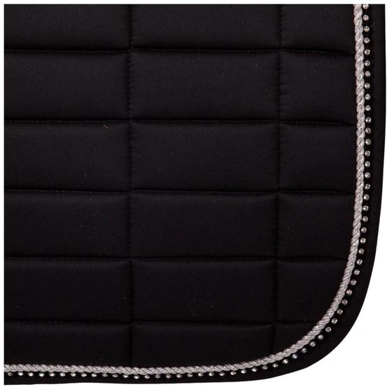 Schicke, vorgeformte Schabracke aus Polyester Baumwolle mit einem Polyester-Airflow Futter. Die Schabracke hat eine 300 g Polyfill Füllung und 10 mm Schaumpolster. Mit quadratischer Steppung, 10 x 5 cm. Sie hat einen silbernen Kordeleinfass und eine Biese mit Strass. Gurtstrippen- und Sattelgurtbefestigung mit Klettverschluss.