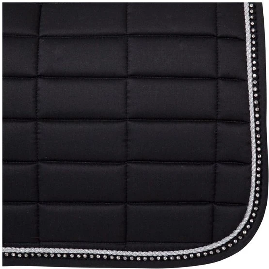 Schicke, vorgeformte Schabracke aus Polyester Baumwolle mit einem Polyester-Airflow Futter. Die Schabracke hat eine 300 g Polyfill Füllung und 10 mm Schaumpolster. Mit quadratischer Steppung, 10 x 5 cm. Sie hat einen silbernen Kordeleinfass und eine Biese mit Strass. Gurtstrippen- und Sattelgurtbefestigung mit Kletverschluss.