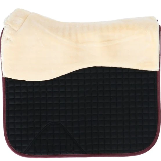 Diese elegante Schabracke aus gestepptem Synthetik-Veloursleder ist am Widerrist und unter dem Rückenteil mit synthetischem Lammfell (100 % Polyester), das sich kaum von echtem Lammfell unterscheidet, versehen. Das Lammfell reicht bis zur Mitte der Schabracke. Diese schaffreundliche Variante ist sehr weich, leicht, atmungsaktiv und besonders pflegeleicht. Das synthetische Fell ist maschinenwaschbar bei 30 °C und ist auch für den Trockner geeignet. Zudem bleibt das Material lange schön und löst sich nicht ab. Die Schabracke hat eine 700-g-Füllung mit 8 mm Schaumstoff und ein feuchtigkeitsregulierendes Cooldry-Mesh-Futter. Darüber hinaus hat die Schabracke eine anatomisch geformte Rückennaht, wodurch weniger schnell Druck auf die Wirbelsäule und den Widerrist ausgeübt wird. Die Sattelunterlage wirkt stoßdämpfend und bietet somit mehr Komfort für Reiter und Pferd. Die Schabracke ist mit verstellbaren Gurtstrupfen und Sattelgurtbefestigungen mit Klettverschluss und einer zusätzlichen Verstärkung bei den Gurtstrupfen ausgeführt.