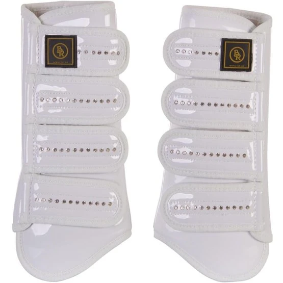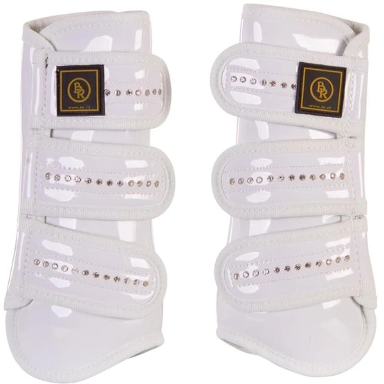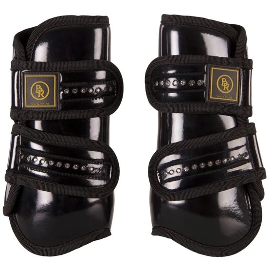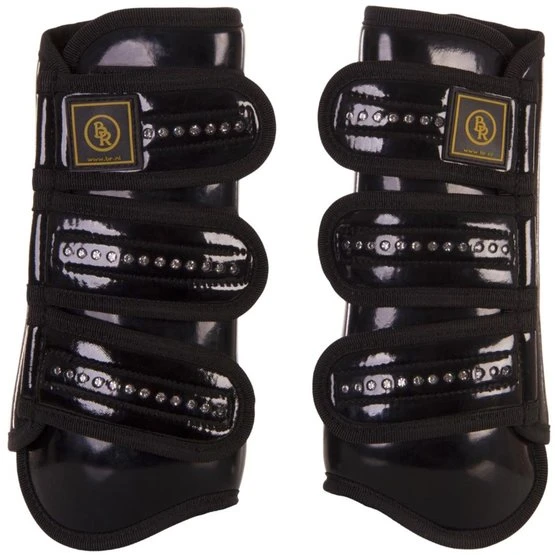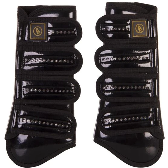 Glänzender BR Pro Max Sehnenschoner mit Strasssteinen. Dieser Sehnenschoner hat ein festes, stossabsorbierendes, 5 mm dickes Neoprenfutter. Die Aussenseite ist aus strapazierfähigem Lackleder. Die stabile, vorgeformte Plastikschale innen bietet optimalen Schutz der Pferdebeine.
