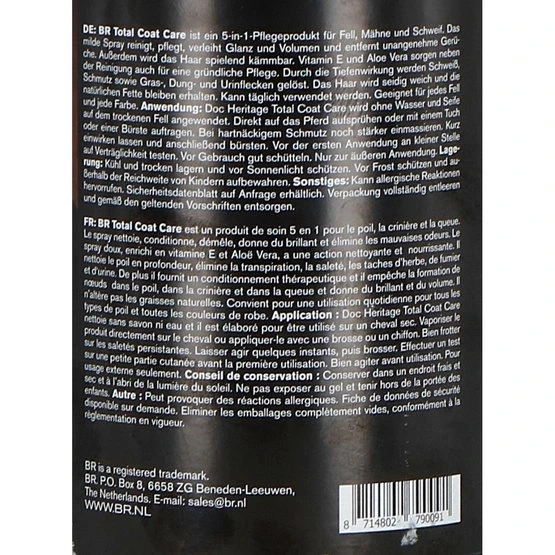 BR Total Coat Care ist ein 5-in-1-Pflegeprodukt für Fell, Mähne und Schweif. Das milde Spray reinigt, pflegt, verleiht Glanz und Volumen und entfernt unangenehme Gerüche. Außerdem wird das Haar spielend kämmbar. Vitamin E und Aloe Vera sorgen neben der Reinigung auch für eine gründliche Pflege. Durch die Tiefenwirkung werden Schweiß, Schmutz sowie Gras-, Dung- und Urinflecken gelöst. Das Haar wird seidig weich und die natürlichen Fette bleiben erhalten. Kann täglich verwendet werden. Geeignet für jedes Fell und jede Farbe. PH-neutral.