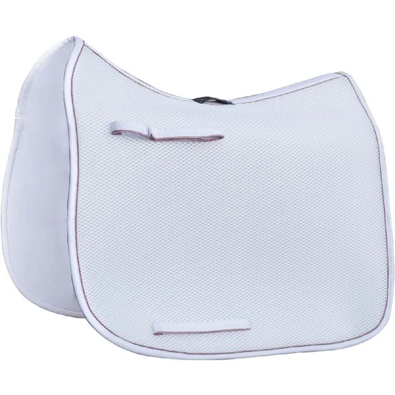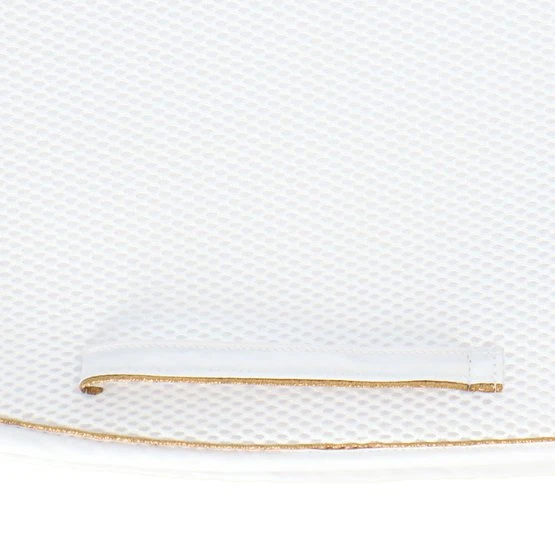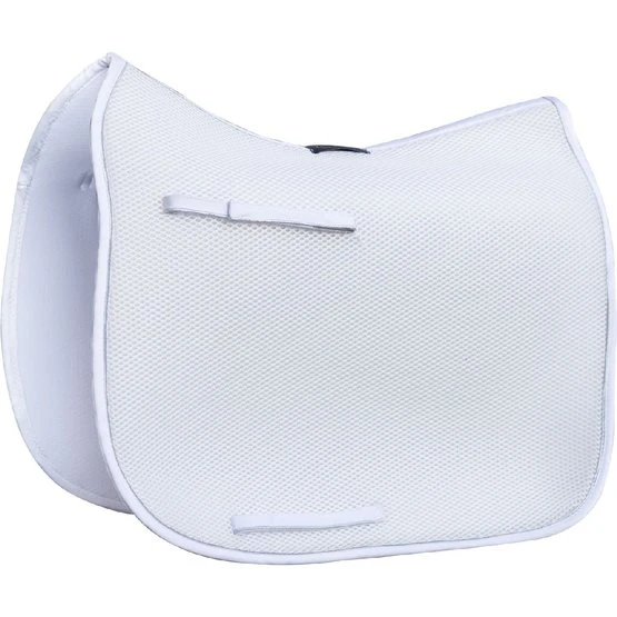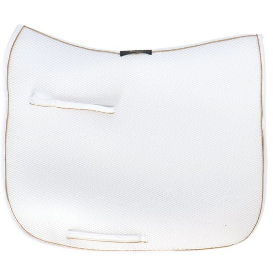 Das 3D-Abstandsmaterial besteht aus Polyesterfasern, die in horizontaler und vertikaler Richtung verwoben sind. Das macht das Material langlebig, belastbar und leicht. Durch die zwei Webrichtungen der Fasern entsteht eine offene Struktur, die sehr belastbar ist. Dadurch bietet es eine gute Druckverteilung und Stoßdämpfung. Ein Vorteil für Reiter und Pferd! Das Material passt sich dem Pferderücken an, springt aber ohne Druck in seinen ursprünglichen Zustand zurück. Dadurch bekommt das Pad keinen Abdruck vom Sattel und die Bewegungen des Pferdes werden gut unterstützt. Die am Pferd anliegende Innenschicht des Pads besteht aus weichen Fasern und ist somit angenehm für das Pferd. Die äußere Schicht ist etwas steifer, damit die Schabracke in Form bleibt und der Reiter gestützt wird.