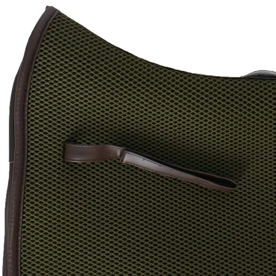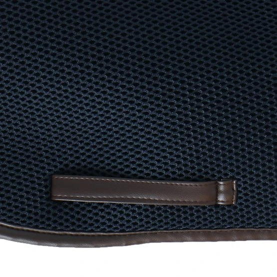 Das 3D-Abstandsmaterial besteht aus Polyesterfasern, die in horizontaler und vertikaler Richtung verwoben sind. Das macht das Material langlebig, belastbar und leicht. Durch die zwei Webrichtungen der Fasern entsteht eine offene Struktur, die sehr belastbar ist. Dadurch bietet es eine gute Druckverteilung und Stoßdämpfung. Ein Vorteil für Reiter und Pferd! Das Material passt sich dem Pferderücken an, springt aber ohne Druck in seinen ursprünglichen Zustand zurück. Dadurch bekommt das Pad keinen Abdruck vom Sattel und die Bewegungen des Pferdes werden gut unterstützt. Die am Pferd anliegende Innenschicht des Pads besteht aus weichen Fasern und ist somit angenehm für das Pferd. Die äußere Schicht ist etwas steifer, damit die Schabracke in Form bleibt und der Reiter gestützt wird.