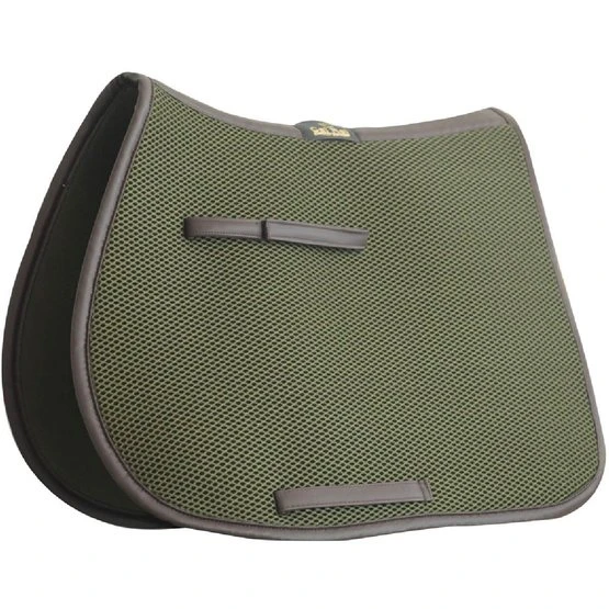 Das 3D-Abstandsmaterial besteht aus Polyesterfasern, die in horizontaler und vertikaler Richtung verwoben sind. Das macht das Material langlebig, belastbar und leicht. Durch die zwei Webrichtungen der Fasern entsteht eine offene Struktur, die sehr belastbar ist. Dadurch bietet es eine gute Druckverteilung und Stoßdämpfung. Ein Vorteil für Reiter und Pferd! Das Material passt sich dem Pferderücken an, springt aber ohne Druck in seinen ursprünglichen Zustand zurück. Dadurch bekommt das Pad keinen Abdruck vom Sattel und die Bewegungen des Pferdes werden gut unterstützt. Die am Pferd anliegende Innenschicht des Pads besteht aus weichen Fasern und ist somit angenehm für das Pferd. Die äußere Schicht ist etwas steifer, damit die Schabracke in Form bleibt und der Reiter gestützt wird.