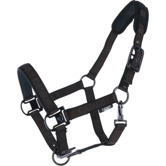 High-End-Halfter mit CATAGO-Logo. Das Halfter hat eine Sympatex-Polsterung am Nasenband und eine abnehmbare Sympatex-Polsterung über der Umfrage. Das Halfter ist am Hals und unter dem Unterkiefer verstellbar.