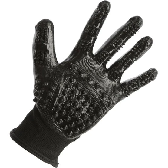 Handschuh und Striegel in Einem • mit unterschiedlich großen Noppen zur Massage des Pferdes und zum Entfernen der Haare bei Fellwechsel • enger Kontakt zum Pferd möglich, dadurch auch an empfindlichen oder schwer zugänglichen Stellen hervorragend einzusetzen • sicherer Sitz durch Handgelenksfixierung mit Klettverschluss • Polyesterstrick mit Beschichtung aus synthetischem Gummi und PVC • paarweise