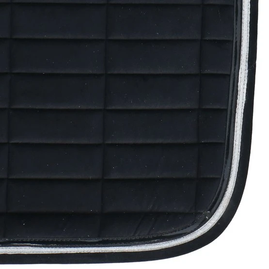 Sattelkissen mit Samteffekt aus 100% Polyester mit rechteckigen Nähten. Gefüttert mit 10 mm Schaum und Polyfill 250 g / m². Mit Doppelrohrleitungen verziert. Das Mesh-Futter macht das Sattelkissen sehr atmungsaktiv.