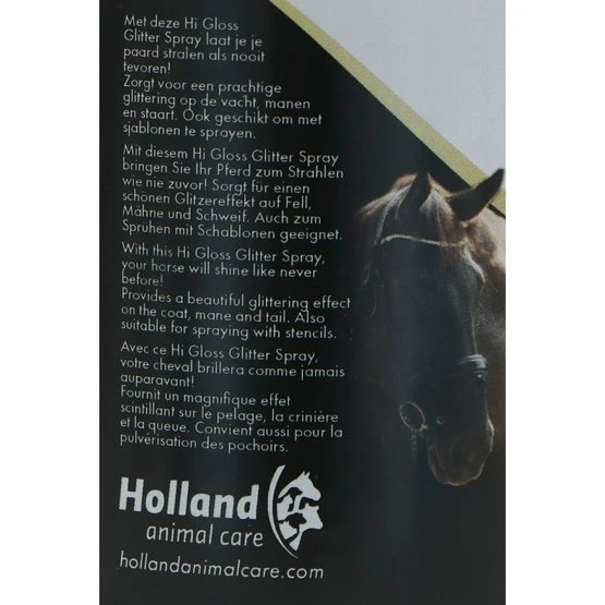 Lasse dein Pferd oder Pony glänzen wie nie zuvor mit diesem Glitzerspray von Hi Gloss. Das Glitzerspray von Hi Gloss sorgt für einen schönen Glitzereffekt auf Fell, Mähne und Schweif. Das Glitzerspray kann mit einer Bürste leicht entfernt werden.