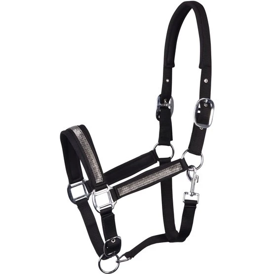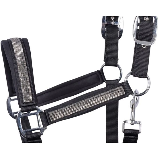 Halfter mit Kristallen an Nase und Kiefer, mit Neopren gepolstert, beidseitig am Genickstück und am Kiefer verstellbar, mit Ösen.