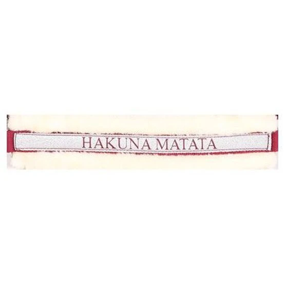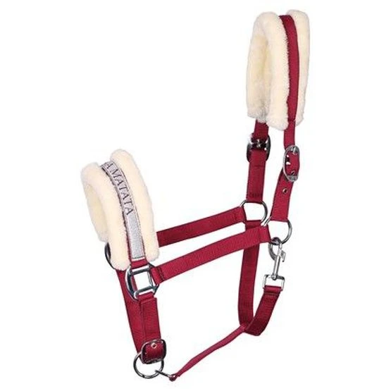 Halfter mit silberfarbenem Band auf der Nase mit lustigem Text. Mit weichem Kunstpelz gefüttert. An beiden Seiten des Kopfstücks und am Kiefer verstellbar. Die Löcher sind mit Ösen versehen.
