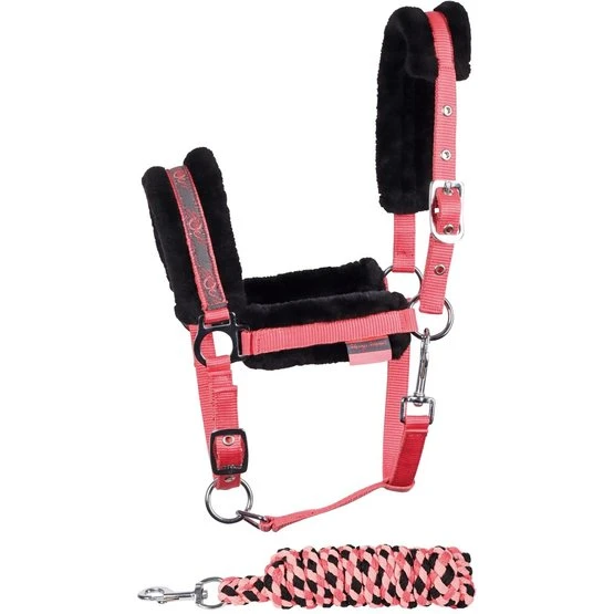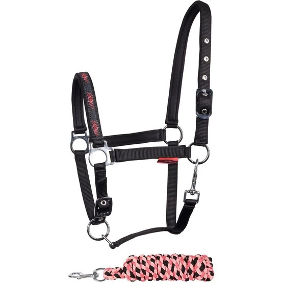 Luxuriöse Trense mit 4 verschiedenfarbigen Kristallen im Stirnband, Nasenriemen mit Paspelierung und weicher Polsterung, Blindverschluss an Backenstücken und Zügeln. Inklusive Gurtzügel mit Stoppern.