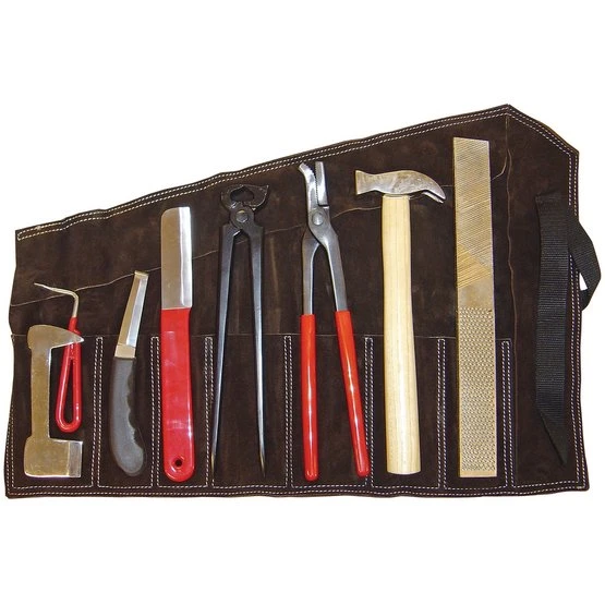 Nagelmesser, Hufkratzer, Hufmesser, Hufkneifzange, Hufhammer und Hufraspel (grobe und feine Seite). Das Hufschmiedset kann außerdem wie eine Hufschmiedschürze getragen werden.