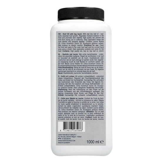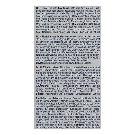 Huföl mit Vaselin und natürlichem Lorbeeröl. Stimuliert das Hufwachstum und hält das Horn geschmeidig. Zur Pflege von trockenen und rissigen Hufen. Sehr effizient im Gebrauch.