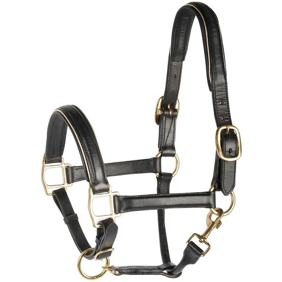 Dieses Lederhalfter mit silber- oder goldfarbenen Schnallen ist an einer Seite des Kopfes und am Kinn verstellbar.
