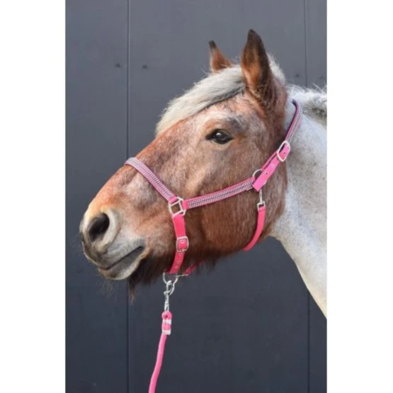 Luxuriös gepolsterter Nylonhalfter an Nase und Stirnband mit schweren Beschlägen. Halfter ist mit Edelsteinen an Nase, Backenstücken und Stirnband verziert. Halfter ist an 2 Stellen verstellbar