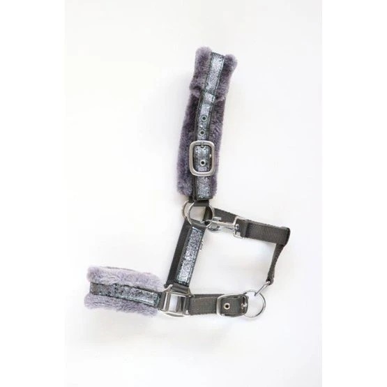 Nylonhalfter mit Teddyfutter an Nase und Genickstück. Das Halfter ist zweifach verstellbar. Mit Glitzer auf Nase und Stirnband