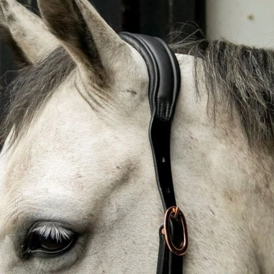 Luxuriöses, weich gepolstertes Halfter mit anatomischem Genickstück und Nasenriemen. Damit soll die Druckverteilung auf Kopf und Nase verschoben werden. Das Halfter ist auf beiden Seiten des Nasenriemens mit roségoldenen Steinen verziert. Und hat roségoldene Kurzwaren und ist an 3 Stellen verstellbar.