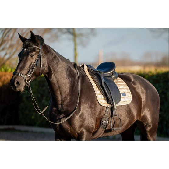 Anatomischer Sattelüberzug mit guter Passform unter dem Sattel. Die Außenseite besteht aus speziellem Stoff mit einem Lake View-Aufdruck und einem luxuriösen Showtime-Namensschild