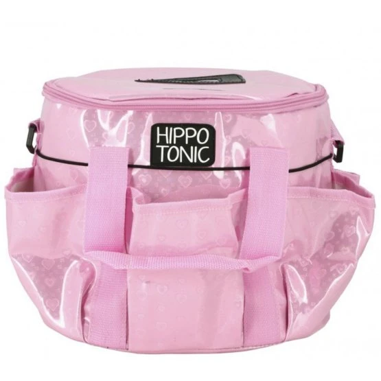 Aus Nylon mit glänzender Oberfläche und leuchtenden Herzmotiven. Mit 6 Außentaschen zur Aufbewahrung aller Pflegematerialien (Bürsten, Kämme und anderes Zubehör) sowie Pflegeprodukten und Beinschützern. Ein Gummiband umgibt die gesamte Tasche, um alle Gegenstände an Ort und Stelle zu halten. 4 Kunststoffnoppen halten die Tasche fest und sauber, fern vom Boden. Sehr praktisch, eine tolle Tasche, die man dank der Griffe und des verstellbaren Schultergurts überallhin mitnehmen kann und dank der Karabiner selbst abnehmbar ist.
