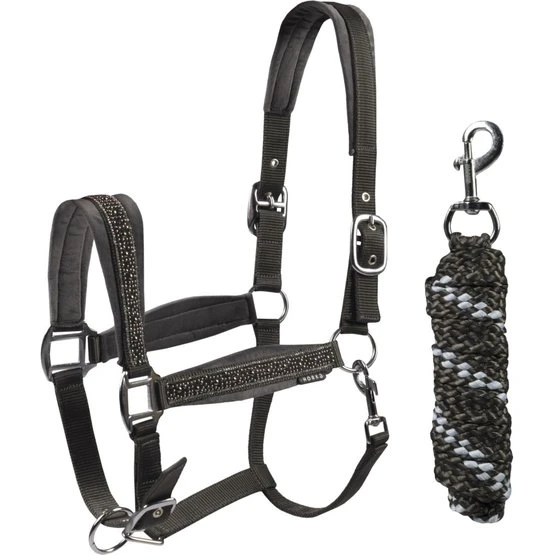 Schicke Halfter inklusive 200 cm langem Führstrick. Das Halfter verfügt über dezente Kristalle und Perlen am Nasenriemen und an den Backenstücken.