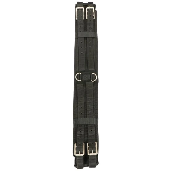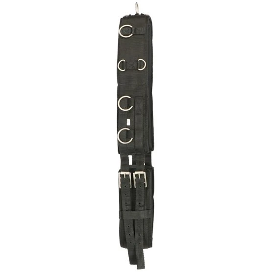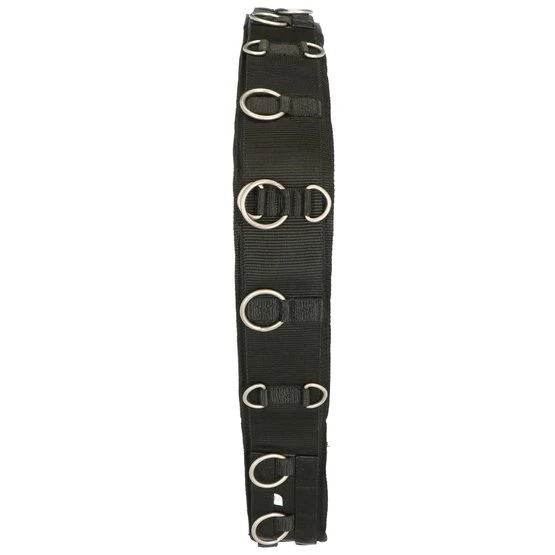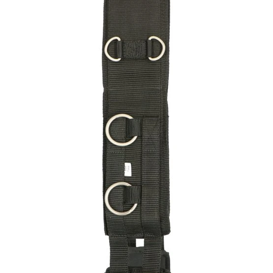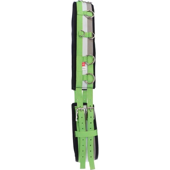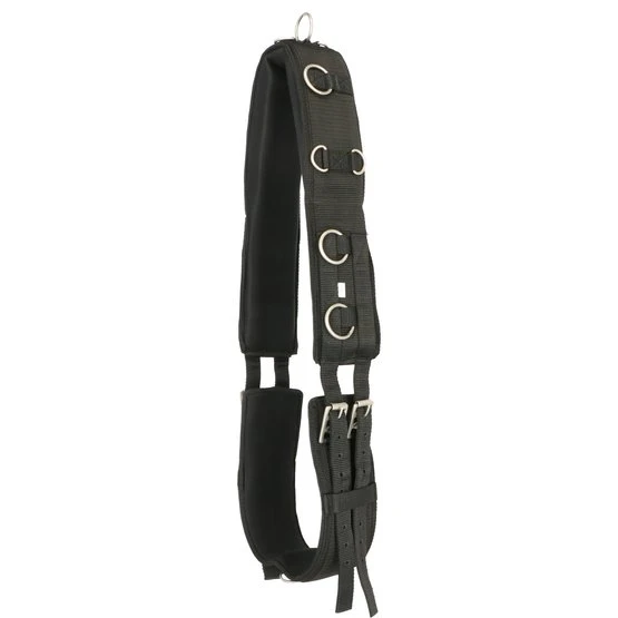 Longiergurt aus Nylon mit Neoprenfutter und Ringen zur Einstellung verschiedener Positionen. Liegt nicht flach am Widerrist an, Freiraum zwischen den Polstern.