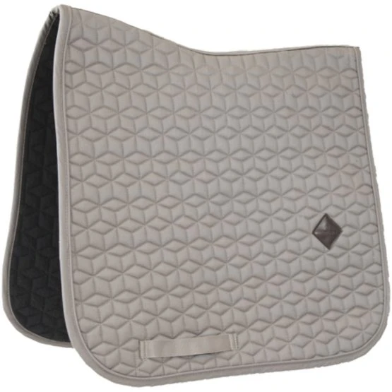 Die Außenseite der Schabracke besteht aus einem baumwollähnlichen Polyester in Würfelsteppung. Auf der linken Seite der Schabracke befindet sich ein kleiner Patch aus veganem Leder mit dem Kentucky-Logo, unterhalb des Logos ist noch genug Platz, um etwas aufzusticken. Das Futter des Bezuges besteht aus einer feuchtigkeitsableitenden Baumwoll-Polyester-Mischung.