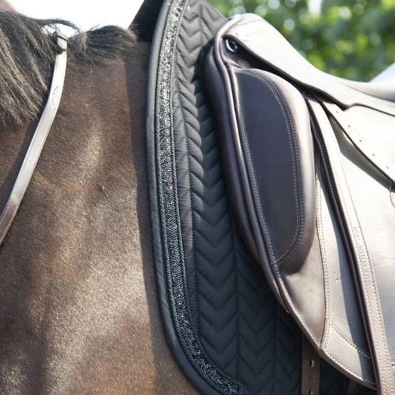 Unsere Glitter Stone Schabracke ist für Dressur oder Springreiten geformt und bietet eine hervorragende Stoßdämpfung und Schutz vor Reibung zwischen dem Rücken Ihres Pferdes und dem Sattel. Die Schabracke hat ein einzigartiges Sternenmuster und ist mit einem schönen Abschluss in Glitzerkordel verziert. Es hat keine lästigen Riemen zum Befestigen am Sattel, nur einen Nylonriemen für den Gurt. Die Decke ist maschinenwaschbar bei 30°, kein Trockner.