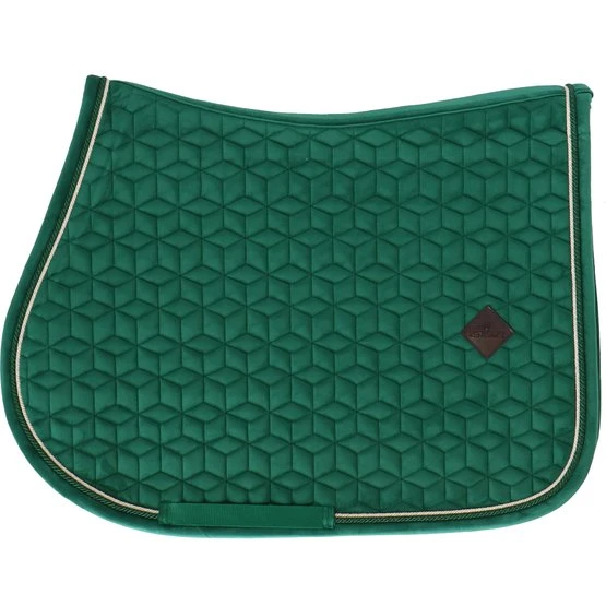 Super stylische und stilvolle Schabracke aus Samt mit doppelt gedrehter Bordüre. Die Samtschabracke ist für das Springendesigned und bietet hervorragende Polsterung zwischen dem Rücken des Pferdes und dem Sattel und schützt gleichzeitig vor Verspannungen. Die Schabrackehat keine lästigen Schlaufen zur Befestigung am Sattel, sondern nur einen Nylonriemen für den Gurt. Das dezente Logo aus Kunstleder ist immer an einer zentralen, etwas höheren Stelle platziert, so dass bei Bedarf immer Platz für die Bestickung mit ihrem eigenen Logo verfügbar ist. Maschinenwaschbar bei 30°, kein Trockner.