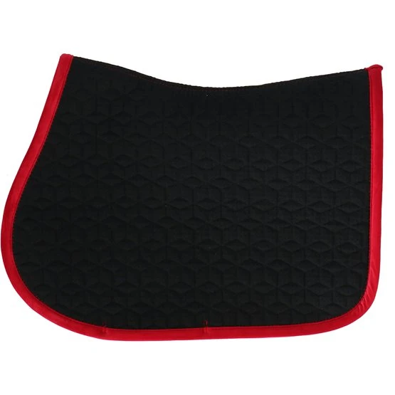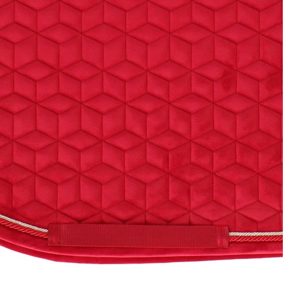 Super stylische und stilvolle Schabracke aus Samt mit doppelt gedrehter Bordüre. Die Samtschabracke ist für das Springendesigned und bietet hervorragende Polsterung zwischen dem Rücken des Pferdes und dem Sattel und schützt gleichzeitig vor Verspannungen. Die Schabrackehat keine lästigen Schlaufen zur Befestigung am Sattel, sondern nur einen Nylonriemen für den Gurt. Das dezente Logo aus Kunstleder ist immer an einer zentralen, etwas höheren Stelle platziert, so dass bei Bedarf immer Platz für die Bestickung mit ihrem eigenen Logo verfügbar ist. Maschinenwaschbar bei 30°, kein Trockner.