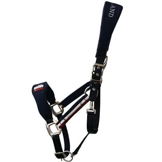 Nylonhalfter mit Fleece-gepolstertem Nasen- und Nackenband. Dreifarbiges Band auf beiden Seiten. Auf den Nasenriemen aufgenähtes Firmenlogo aus Silikon. Kingsland-Stickerei am Genickstück.