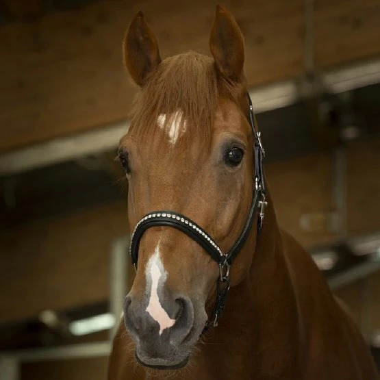 Büffellederhalfter mit zweifach verstellbarem anatomischem Genickstück, mit Rindsleder gefüttert. Verstellbarer Nasenriemen mit transparentem Strass, gefüttert mit Rindsleder. Schließen Sie mit 3 Muskatons. Schwarze Nähte für das schwarze Leder und weiße Nähte für das havannafarbene Leder. Schnallen aus Edelstahl.