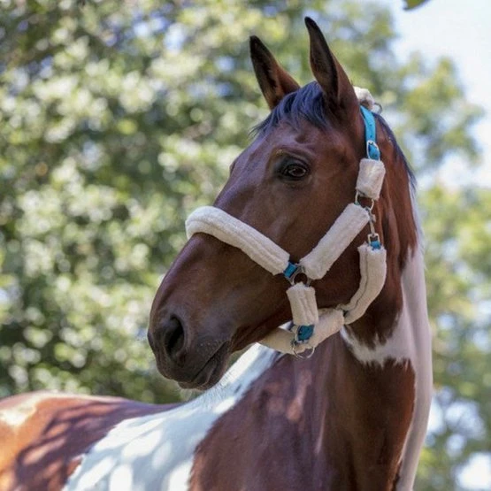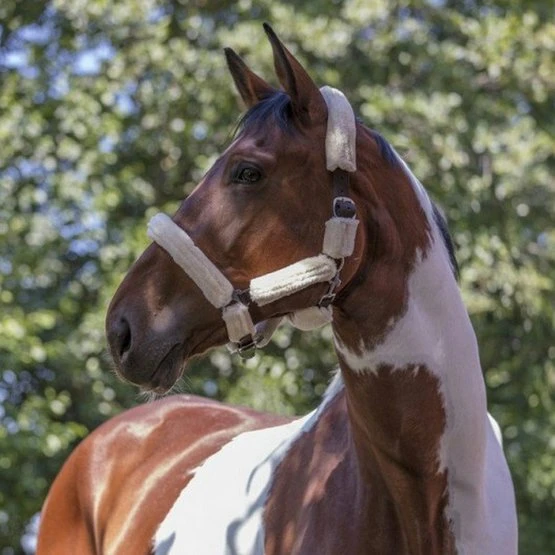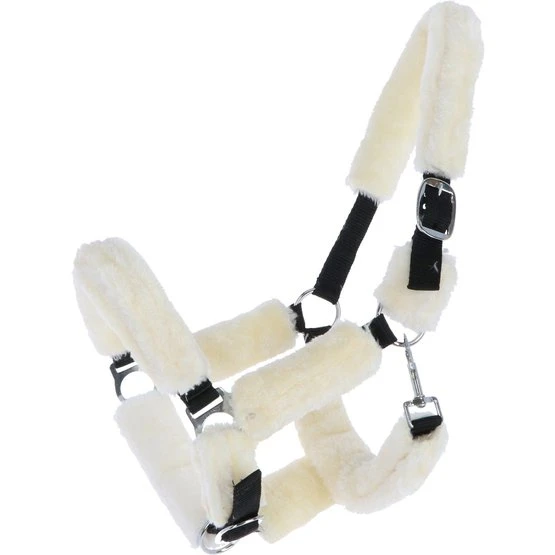 Verstellbares Polypropylenhalfter mit Schnellverschluss, komplett mit synthetischem Schaffell bezogen, abnehmbar mit Klettverschluss.