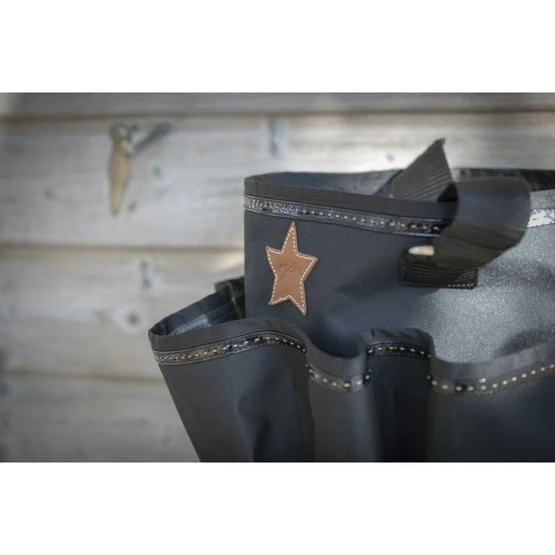 PENELOPE „Grooming“ Tasche. Mit einem großen zentralen Fach und 8 kleinen Fächern drum herum ist es ideal, um alle Pflegeprodukte (Bürsten, Lockenkamm, Kämme, Bürsten usw.) oder Pflegeprodukte (Spray, Creme usw.) aufzubewahren. Sie besteht aus einem schweren Canvas-Stoff und hat auch einen Griff, der mit einem silbernen Karabiner leicht abgenommen werden kann. Der Griff erleichtert das Tragen und Aufhängen der Putztasche überall, im Stall oder auf Turnieren.