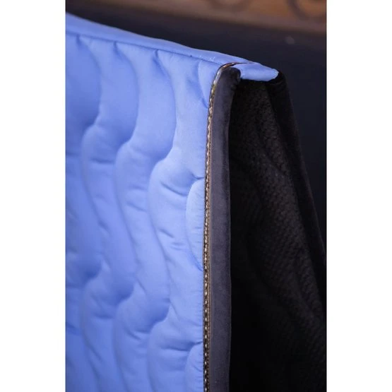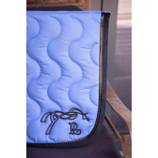 Gewellt genähte, gepolsterte Schabracke. Gefüttert mit weißem Wabenstoff. Zwei Gurtschlaufen aus Nylon (eine auf jeder Seite). Auf der linken Seite ist ein springendes Pferd aufgestickt. Außenmaterial: 60 % Polyester + 40 % Baumwolle. Füllung: 100 % Polyester. Futter: 100 % Baumwolle. Maschinenwaschbar bei 30 °C. Nicht im Trockner.