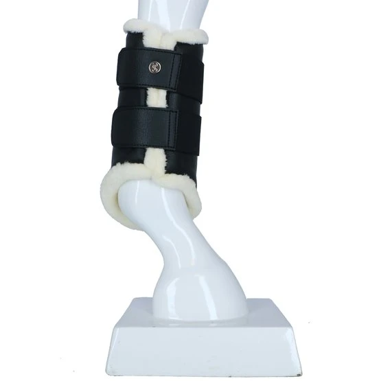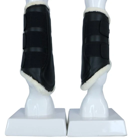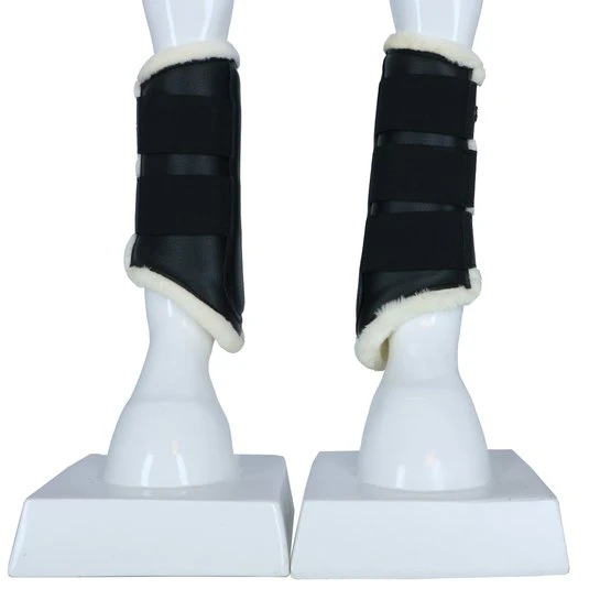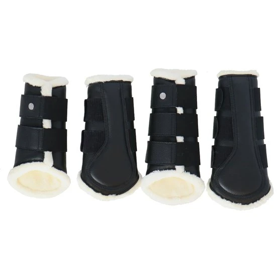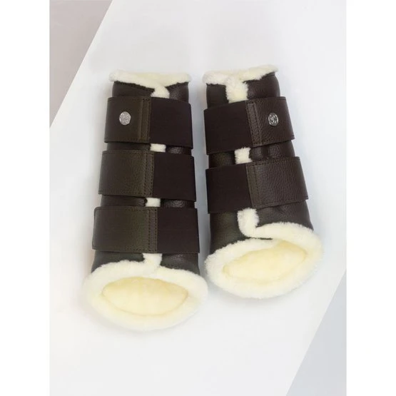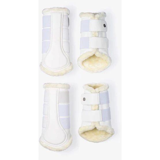 Beinschützer mit elastischen Klettverschlüssen. Die Stiefel haben eine vegane Lederoberfläche und einen gepolsterten Patch auf der Innenseite zum Schutz und sind vollständig mit weißem Kunstpelz gefüttert. Die Vorderseite hat zwei Spanngurte und die Rückseite drei – alle mit einem PS-Logo-Knopf. 4 Packung.
