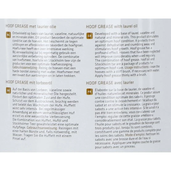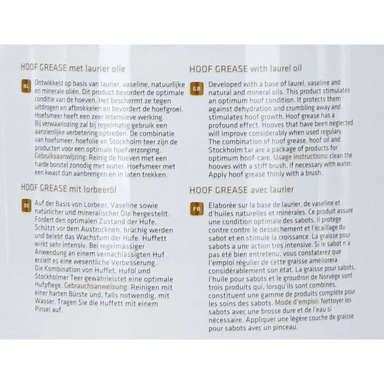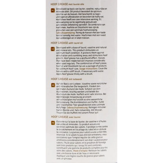 Dieser Bedarf ist mehr entwickelt auf der Basis von Lorbeer, Vaseline und natürlichen und Mineralölen. Dieses Produkt fördert den optimalen Zustand der Hufe. Es schützt sie vor dem Austrocknen und bröckelt und fördert Hufwachstum. Horseshoe Lake ist ein sehr intensiver Betrieb. Vernachlässigen wird eine deutliche Verbesserung auftreten, wenn regelmäßig verwendet. Die Kombination von mehr Hufe, Huföl und Stockholm Teer sind die Produkte für eine optimale Hufpflege.