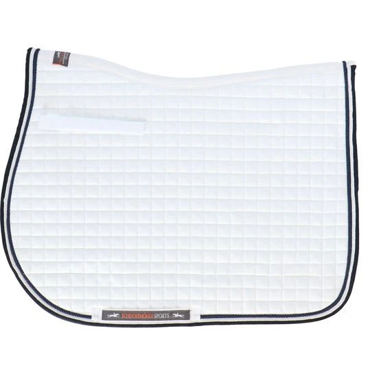 und sorgt so für einen entspannten Pferdrücken. Optisch überzeugt die Schabracke mit einer schicken Kordel und zweifarbiger Einfassung. Das Schockemöhle Sports Logo ziert Gurtband und die linke Seite der Schabracke.
