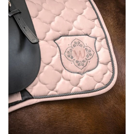 Elegante, hochwertige Schabracke mit floraler Steppung in Seidenoptik. Eine Applikation mit Strasssteinen macht die Schabracke zu einem echten Hingucker. Die funktionelle Unterseite sorgt für eine optimale Atmungsaktivität. 10 mm Schaum und 200 g/m² Wattierung gewährleisten beste Druckverteilung.