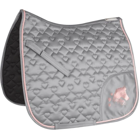 Hochwertige Schabracke mit einseitiger Glitter-Pferd-Applikation in Silber, Herzchen-Steppung und rosafarbener Kordel. Passend zu unserer Lucky Heart Kollektion. 200 g/m² Wattierung und 10 mm Spezialschaum sorgen für einen optimalen Druckausgleich und Stoßdämpfung.