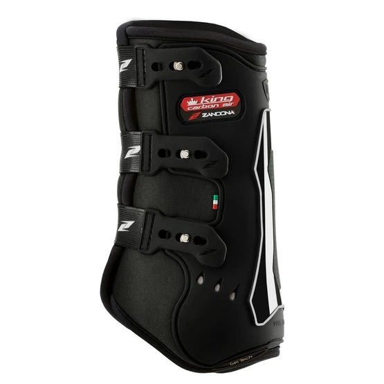 Die zu 100% in Italien hergestellten „KING CARBON AIR“ sind darauf ausgelegt, den Sehnenapparat zu halten und zu unterstützen, während Pferde während der Dressur vor Kollisionen und Blutergüssen an Streichhölzern und Kanonen geschützt werden. Sie sind mit einem revolutionären Verriegelungssystem (PATENTIERT) ausgestattet, das die Positionierung am Bein erleichtert, mehr Halt bietet als herkömmliche Stiefel auf dem Markt sowie perfekte Anpassungsfähigkeit und Stabilität. Sie bestehen aus einer externen TPU-Struktur mit differenzierter Dicke, die dank des perforierten Neoprens durchscheint und durch 6 Lüftungsöffnungen über dem Streichholz belüftet wird. Gel-Tech ist zwischen der externen TPU-Struktur und der Neopren-Unterlage enthalten und dient bei Bedarf als Stoßdämpfer und komfortable Polsterung. Unter der Schale befinden sich Kohlefaserelemente, die die Gelenke thermisch gegen die durch äußere Reibung entstehende Wärme isolieren und gleichzeitig die mechanische Schlagfestigkeit erhöhen. Nah am Vordermittelfuß wurde eine Flex-Zone geschaffen, die für maximale Bewegungsfreiheit der Extremitäten notwendig ist. Die elastischen Bänder mit Schnellverschluss sind für ein sicheres Schließen kalibriert und verfügen über ein doppeltes Verriegelungssystem (horizontal / vertikal). Seine Abmessung und seine absolut ergonomische Form wurden entwickelt, um die Gliedmaßenstruktur exakt nachzubilden, eine perfekte Positionierung zu gewährleisten und jegliche Art von Stress zu vermeiden.